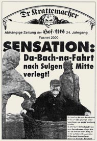 Früher gab die Narrenzunft Sulgen das Sulgener "Narrenblättle" heraus, den "Feinkorbflechter". Lothar Neudeck hatte schon dort als Redakteur mitgewirkt. In den frühen 70-er Jahren stellte die Narrenzunft Sulgen dann das Erscheinen des "Feinkorbflechters" ein. Nach einigen Jahren Pause, in denen verschiedene Gruppen, unter anderem die Vorgänger der HOF AG ein "Notnarrenblättle" heraus gebracht hatten, entschlossen wir uns eine eigene Narrenzeitung heraus zu bringen. Der erste KRATTENMACHER erschien pünktlich zum Fasnetssamstag 1976 in einer ersten beachtlichen 20-seitigen Ausgabe. Geschrieben wurde damals noch in den Räumen der Firma Ladenbau Ganter GmbH und zwar alle Artikel an einem Tag mit Schreibmaschine und Korrekturbändern. Es ging zu wie in einer Redaktion einer großen Tageszeitung. Anruf, Recherchen, Textänderungen und, und, und. Chefgrafiker vom Dienst war damals Uwe Rettkowski, der den KRATTENMACHER mit Bildern und Zeichnungen versah, Chefredakteur war Lothar Neudeck. Gedruckt wurde damals noch in Freiburg. Die losen DIN A2 Bögen wurden am Freitag Nachmittag in Freiburg geholt und in der Nacht von Freitag auf Samstag bei "Ganters" zusammengelegt und gefaltet. Die erste Ausgabe umfasste 1000 Exemplare. Sie wurden nahezu alle verkauft. Heute ist der KRATTENMACHER Nr. 1 eine Rarität. Er erschien im Übrigen ab 1976 regelmäßig jährlich immer am Fasnetssamstag und wurde lange Zeit ausschließlich von den Mitgliedern der HOF AG in Sulgen und Heiligenbronn von Haus zu Haus verkauft. Erst Mitte der 80-er Jahre wurde er dann auch in verschiedenen Sulgener Geschäften ausgelegt, wo er am Fasnetssamstag Morgen ebenfalls reißenden Absatz fand. Im Jahre 1991 gab es eine durch den Golfkrieg bedingte Pause. Am Fasnetssamstag des Jahres 1992 erschien der KRATTENMACHER dann mit dem Titel: "Endlich! Nach 736 Tagen ist die wüste Durststrecke endlich vorbei." All die Jahre hindurch wurde der KRATTENMACHER in den Sulgener Geschäften und ansonsten ausschließlich von HOF AG Gruppen von Haus zu Haus verkauft. Lediglich im Jahre 1993 übernahmen die Berghexen den Verkauf, nachdem am 23.01.1993 Horst Profft verstorben war und die HOF AG in diesem Jahr weitestgehend auf eine Teilnahme an der Fasnet verzichtete. Inzwischen erscheint der KRATTENMACHER mit einer Auflage von 1400 Exemplaren und umfasst in der Regel immer zwischen 36 und 40 Seiten. Es hat auch schon Jahre gegeben, als er 48 Seiten umfasste. Geschrieben wird er nach wie vor hauptsächlich von Lothar Neudeck, Udo Neudeck und Franz Rapp. Gestaltet wird er nun von Sebastian Iffländer, Guido Neudeck, Thomas Lamm und Uwe Rettkowski. |